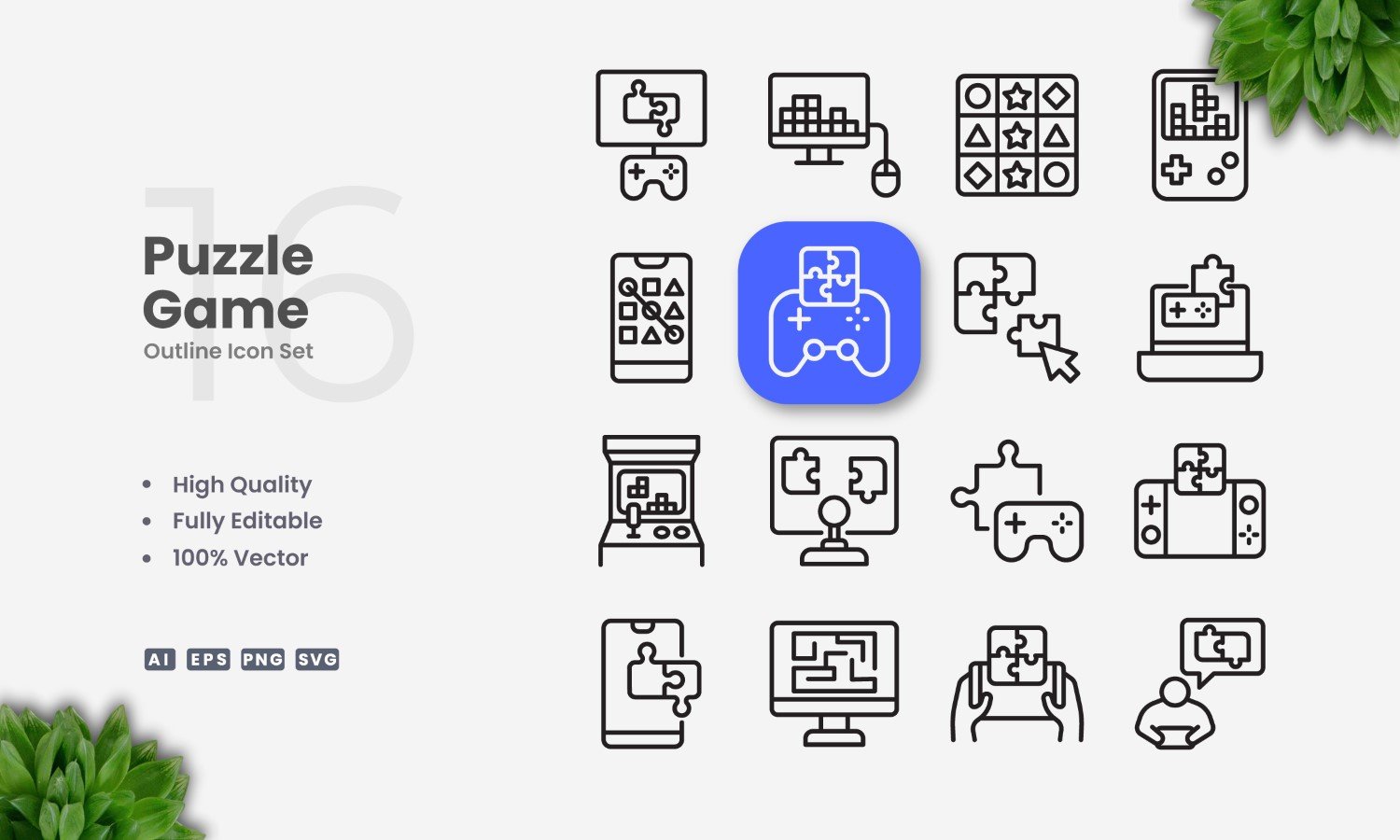 Set of 16 Puzzle Game outline icons | Simple and clean design, perfect for websites, mobile apps, books, social media, infographics, flyer, print, banners, posters and many more. To resize, change color, or edit stroke weight, you can easily edit on vector software like Adobe Illustrator and CorelDRAW.