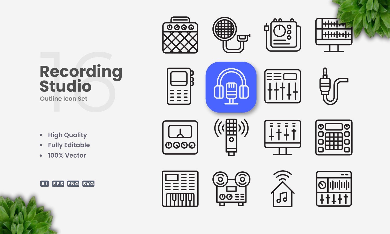 Set of 16 Recording Studio outline icons | Simple and clean design, perfect for websites, mobile apps, books, social media, infographics, flyer, print, banners, posters and many more. To resize, change color, or edit stroke weight, you can easily edit on vector software like Adobe Illustrator and CorelDRAW.