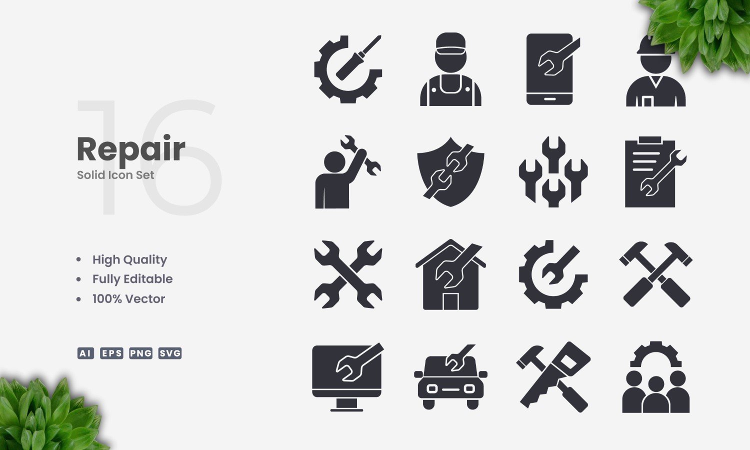 Set of 16 Repair solid icons | Simple and clean design, perfect for websites, mobile apps, books, social media, infographics, flyer, print, banners, posters and many more. To resize or change color you can easily edit on vector software like Adobe Illustrator and CorelDRAW.