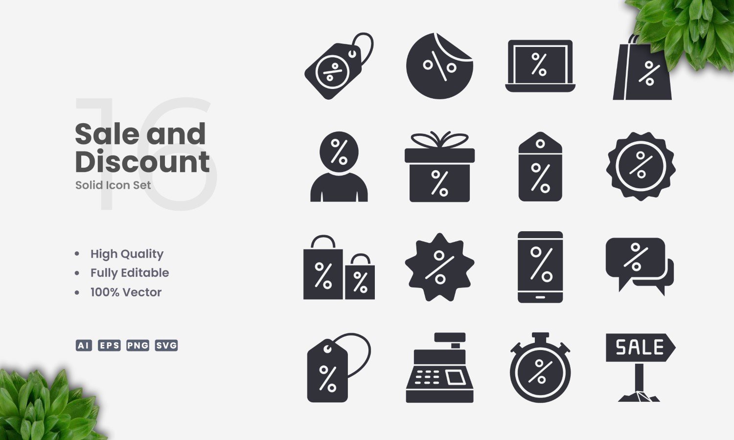 Set of 16 Sale and Discount solid icons | Simple and clean design, perfect for websites, mobile apps, books, social media, infographics, flyer, print, banners, posters and many more. To resize or change color you can easily edit on vector software like Adobe Illustrator and CorelDRAW.