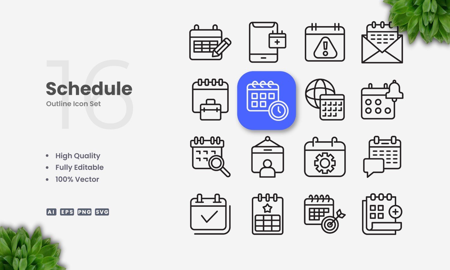 Set of 16 Schedule outline icons | Simple and clean design, perfect for websites, mobile apps, books, social media, infographics, flyer, print, banners, posters and many more. To resize, change color, or edit stroke weight, you can easily edit on vector software like Adobe Illustrator and CorelDRAW.