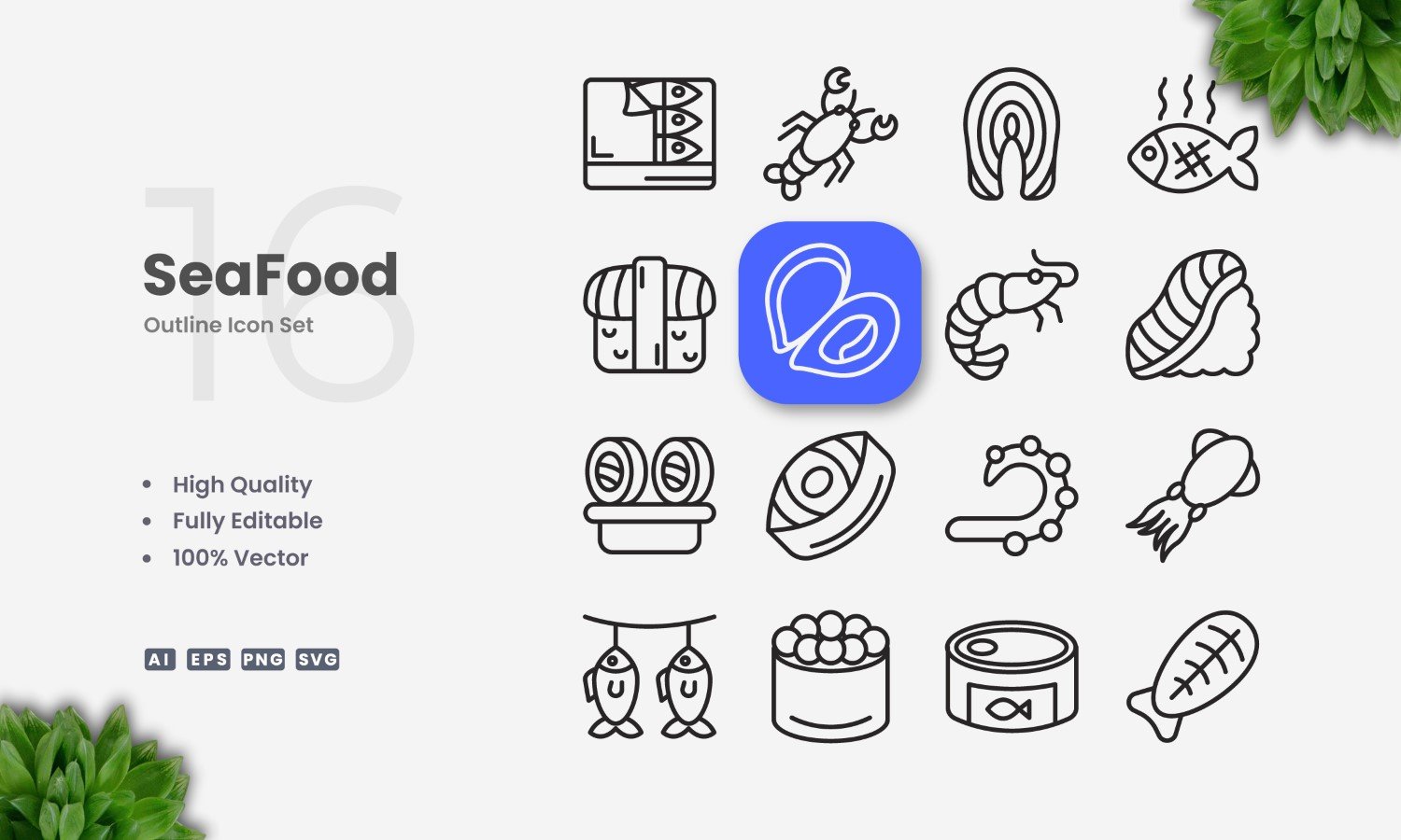 Set of 16 Seafood outline icons | Simple and clean design, perfect for websites, mobile apps, books, social media, infographics, flyer, print, banners, posters and many more. To resize, change color, or edit stroke weight, you can easily edit on vector software like Adobe Illustrator and CorelDRAW.