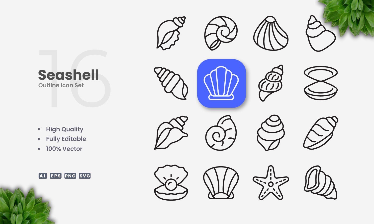 Set of 16 Seashell outline icons | Simple and clean design, perfect for websites, mobile apps, books, social media, infographics, flyer, print, banners, posters and many more. To resize, change color, or edit stroke weight, you can easily edit on vector software like Adobe Illustrator and CorelDRAW.