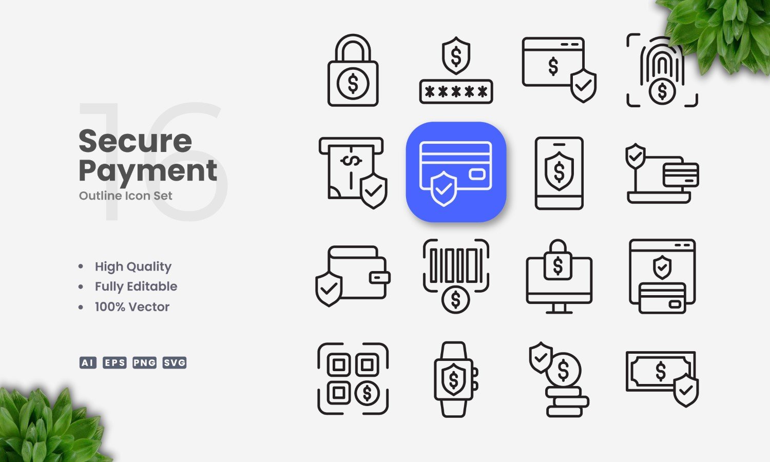 Set of 16 Secure Payment outline icons | Simple and clean design, perfect for websites, mobile apps, books, social media, infographics, flyer, print, banners, posters and many more. To resize, change color, or edit stroke weight, you can easily edit on vector software like Adobe Illustrator and CorelDRAW.