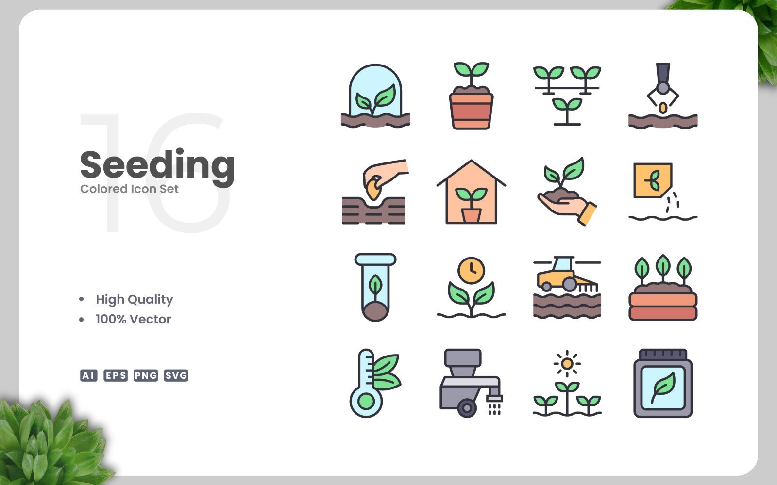 Set of 16 Seeding colored icons | Simple and clean design, perfect for websites, mobile apps, books, social media, infographics, flyer, print, banners, posters and many more. To resize or change color you can easily edit on vector software like Adobe Illustrator and CorelDRAW.