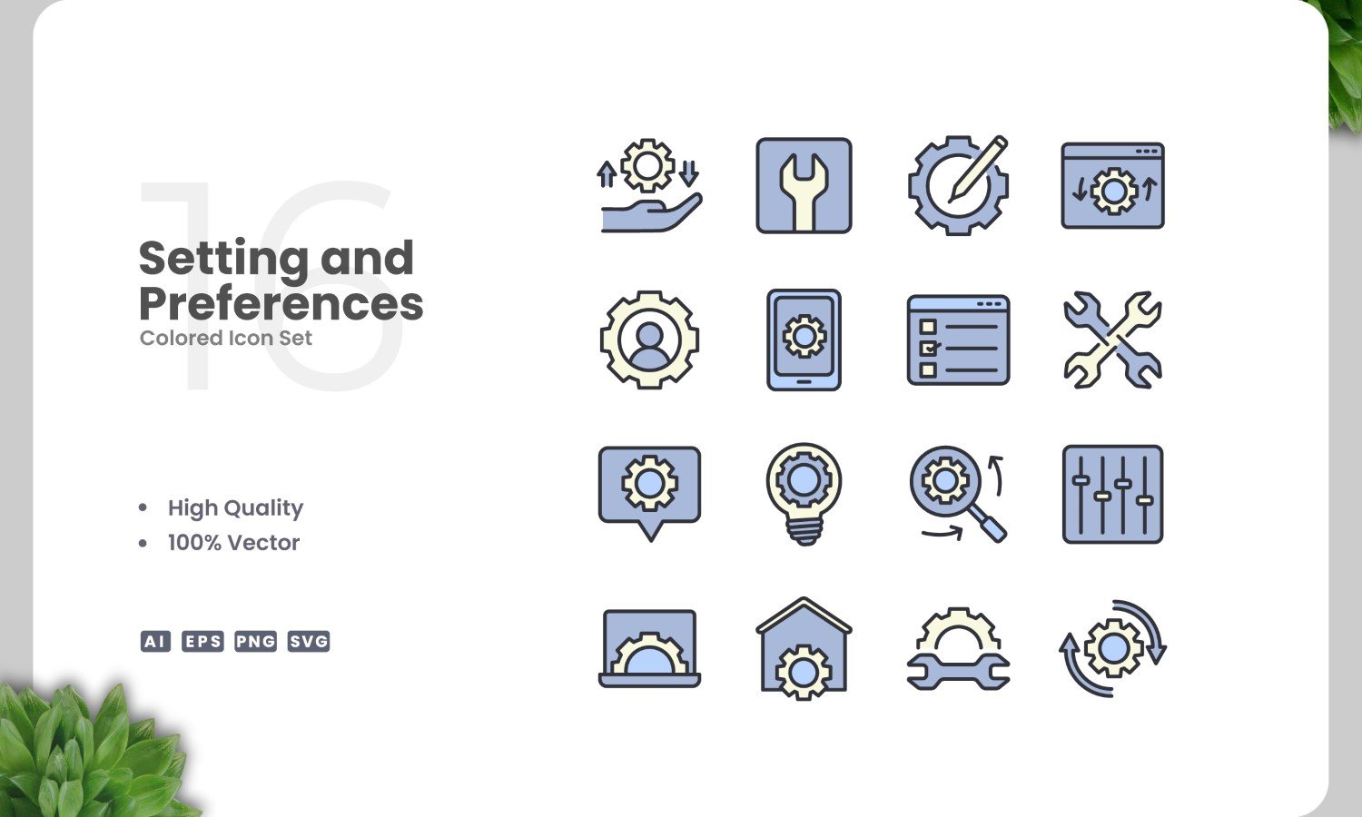 Set of 16 Settings and Preferences color icons | Simple and clean design, perfect for websites, mobile apps, books, social media, infographics, flyer, print, banners, posters and many more. To resize or change color you can easily edit on vector software like Adobe Illustrator and CorelDRAW.
