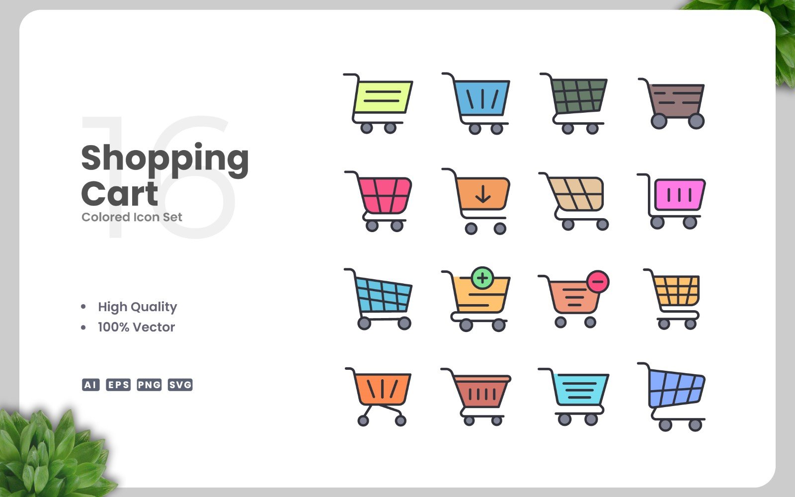 Set of 16 Shopping Cart colored icons | Simple and clean design, perfect for websites, mobile apps, books, social media, infographics, flyer, print, banners, posters and many more. To resize or change color you can easily edit on vector software like Adobe Illustrator and CorelDRAW.