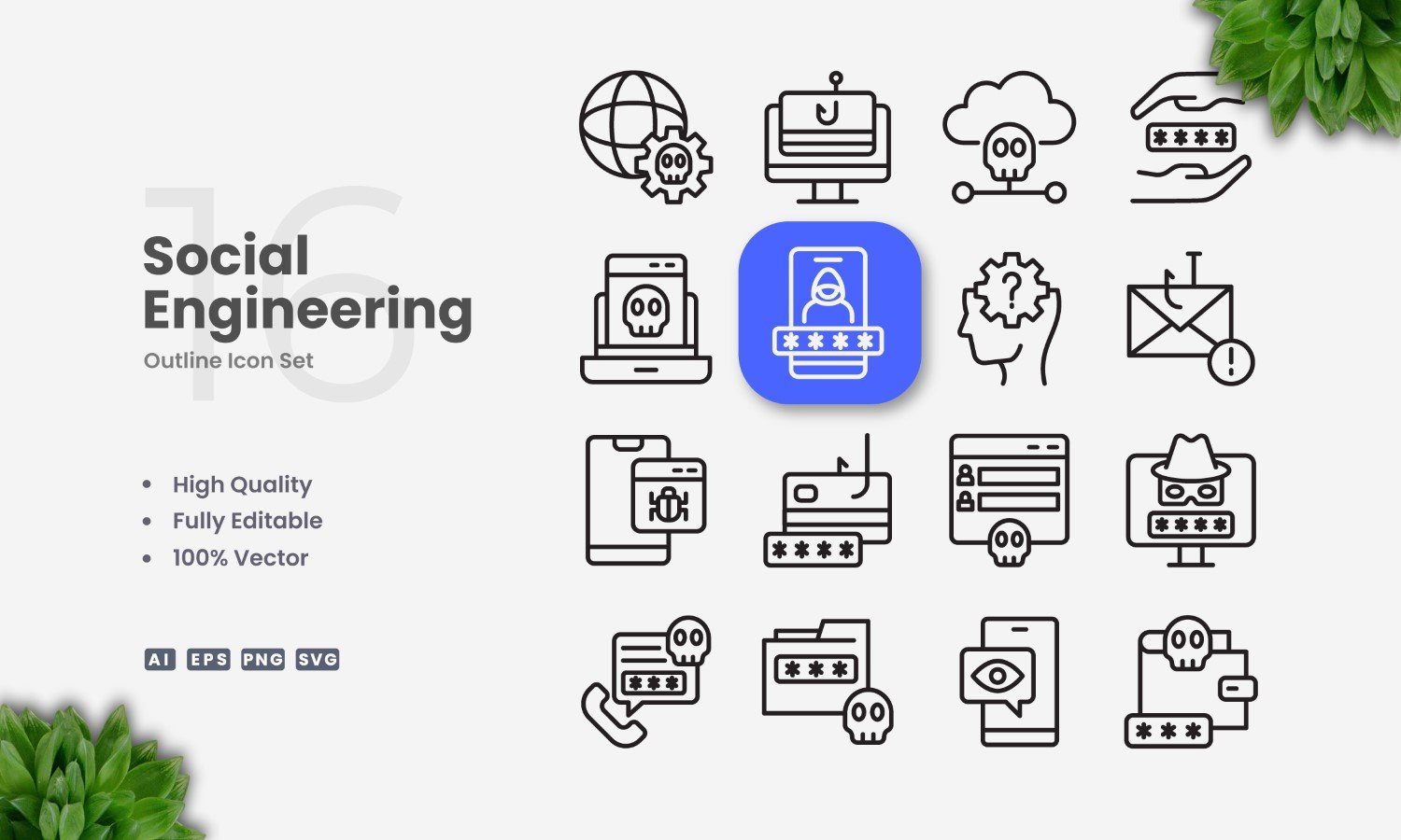 Set of 16 Social Engineering outline icons | Simple and clean design, perfect for websites, mobile apps, books, social media, infographics, flyer, print, banners, posters and many more. To resize, change color, or edit stroke weight, you can easily edit on vector software like Adobe Illustrator and CorelDRAW.