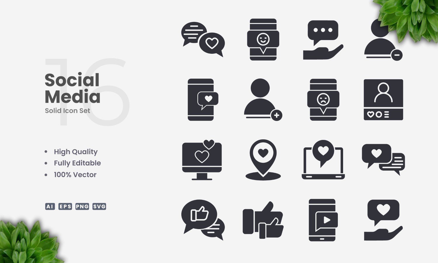 Set of 16 Social Media solid icons | Simple and clean design, perfect for websites, mobile apps, books, social media, infographics, flyer, print, banners, posters and many more. To resize or change color you can easily edit on vector software like Adobe Illustrator and CorelDRAW.