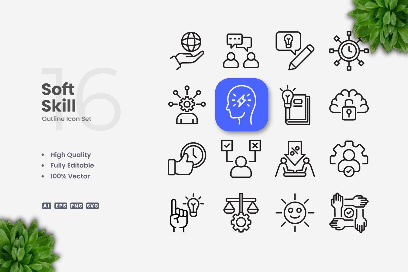 Set of 16 Soft Skills outline icons | Simple and clean design, perfect for websites, mobile apps, books, social media, infographics, flyer, print, banners, posters and many more. To resize, change color, or edit stroke weight, you can easily edit on vector software like Adobe Illustrator and CorelDRAW.