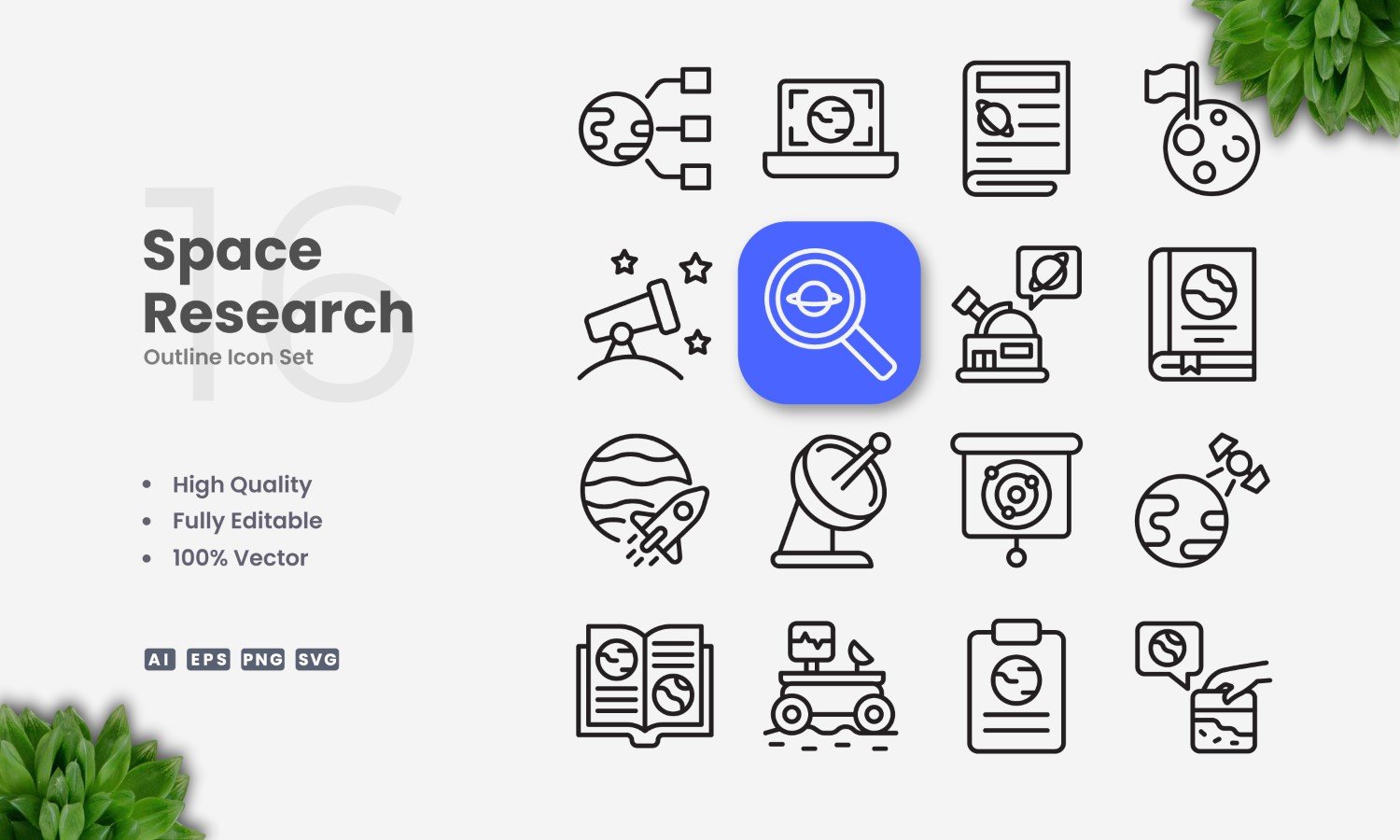 Set of 16 Space Research outline icons | Simple and clean design, perfect for websites, mobile apps, books, social media, infographics, flyer, print, banners, posters and many more. To resize, change color, or edit stroke weight, you can easily edit on vector software like Adobe Illustrator and CorelDRAW.