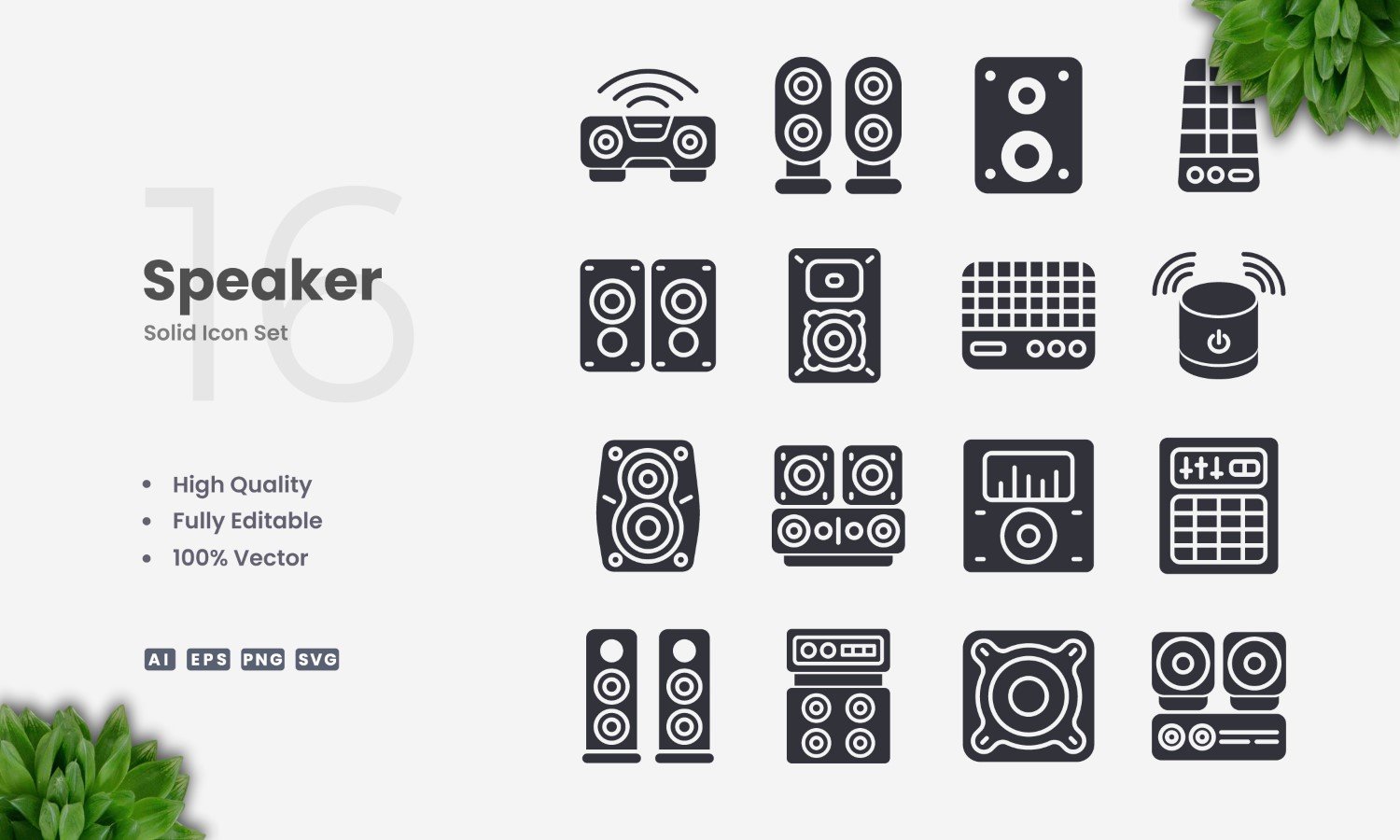Set of 16 Speaker solid icons | Simple and clean design, perfect for websites, mobile apps, books, social media, infographics, flyer, print, banners, posters and many more. To resize or change color you can easily edit on vector software like Adobe Illustrator and CorelDRAW.
