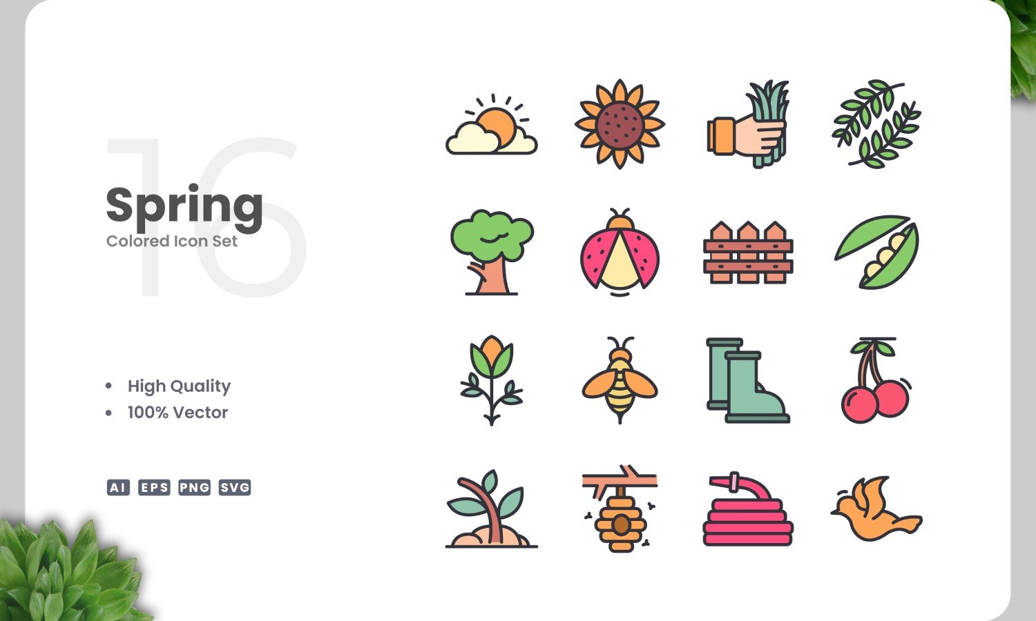 Set of 16 Spring color icons | Simple and clean design, perfect for websites, mobile apps, books, social media, infographics, flyer, print, banners, posters and many more. To resize or change color you can easily edit on vector software like Adobe Illustrator and CorelDRAW.