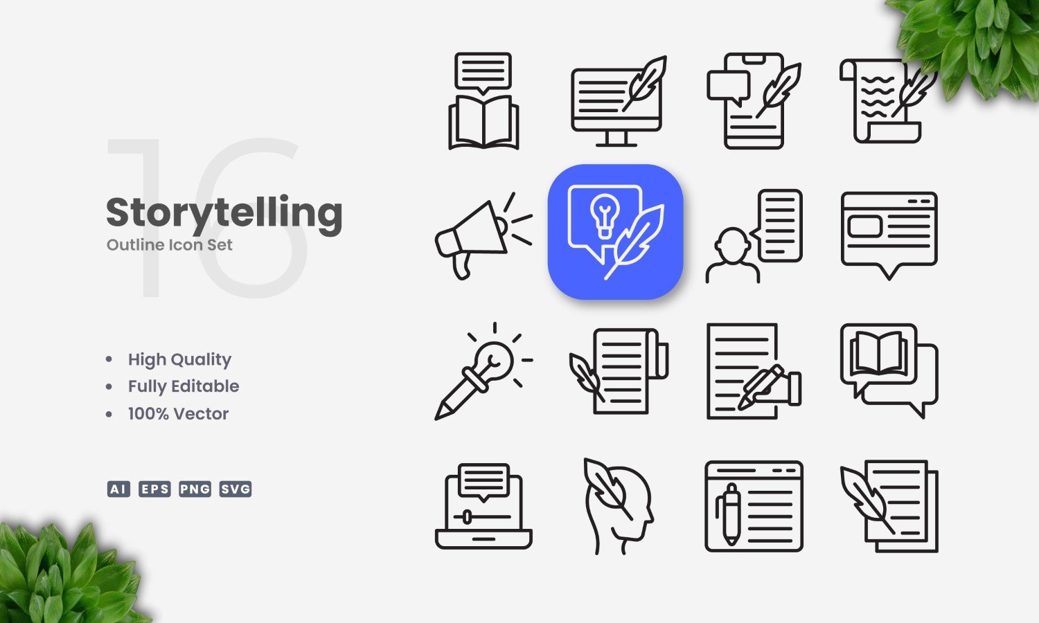 Set of 16 Storytelling outline icons | Simple and clean design, perfect for websites, mobile apps, books, social media, infographics, flyer, print, banners, posters and many more. To resize, change color, or edit stroke weight, you can easily edit on vector software like Adobe Illustrator and CorelDRAW.