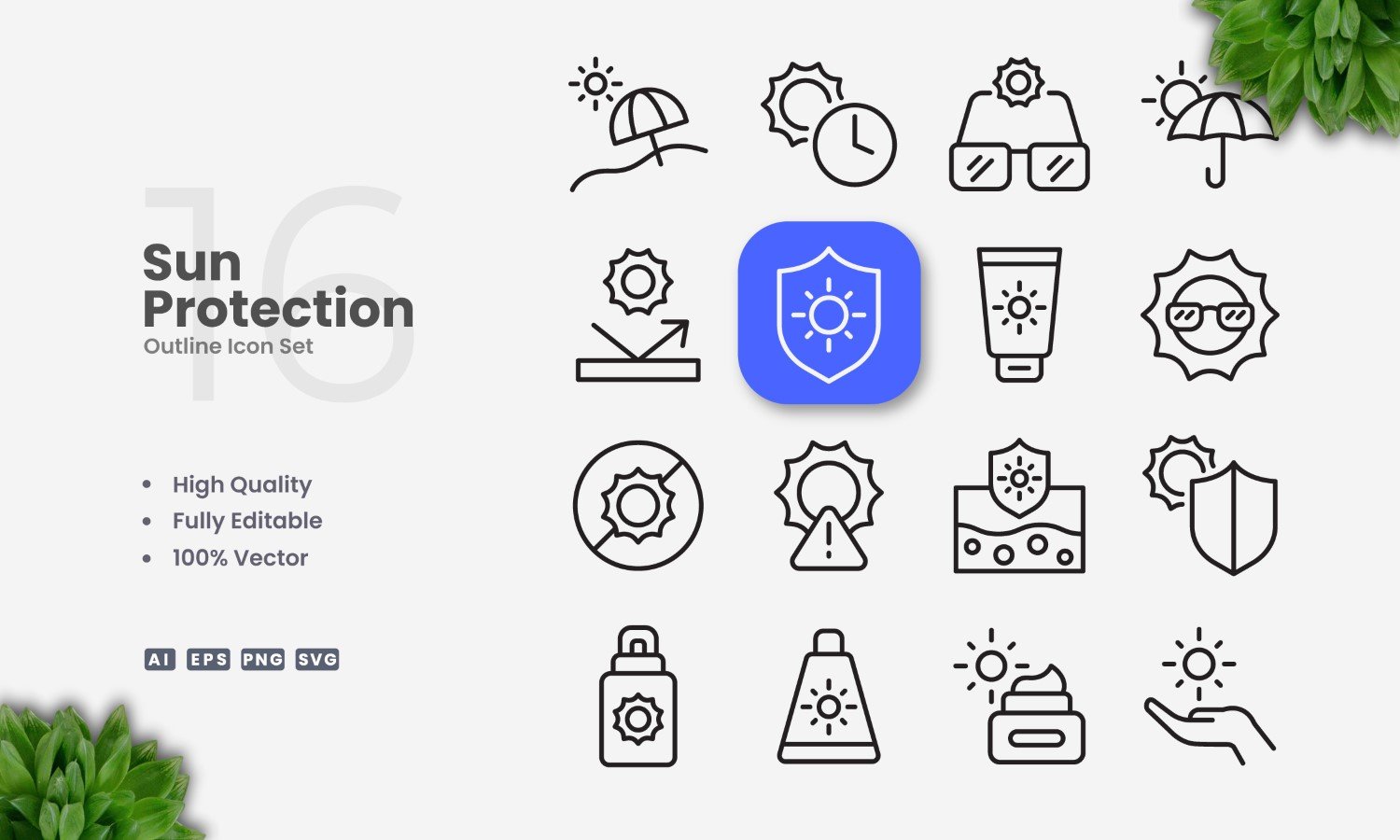 Set of 16 Sun Protection outline icons | Simple and clean design, perfect for websites, mobile apps, books, social media, infographics, flyer, print, banners, posters and many more. To resize, change color, or edit stroke weight, you can easily edit on vector software like Adobe Illustrator and CorelDRAW.