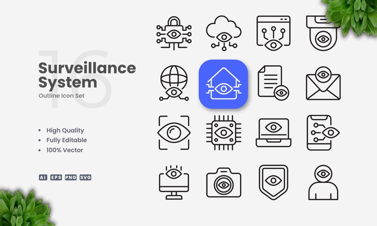 Set of 16 Surveillance System outline icons | Simple and clean design, perfect for websites, mobile apps, books, social media, infographics, flyer, print, banners, posters and many more. To resize, change color, or edit stroke weight, you can easily edit on vector software like Adobe Illustrator and CorelDRAW.