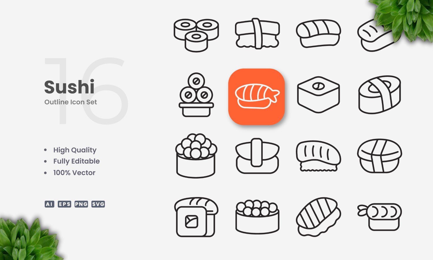 Set of 16 Sushi outline icons | Simple and clean design, perfect for websites, mobile apps, books, social media, infographics, flyer, print, banners, posters and many more. To resize, change color, or edit stroke weight, you can easily edit on vector software like Adobe Illustrator and CorelDRAW.