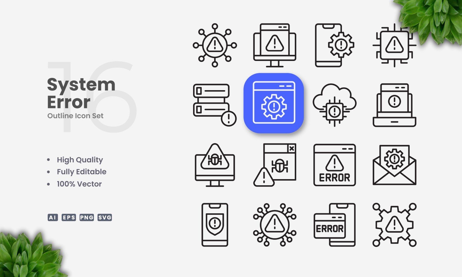 Set of 16 System Error outline icons | Simple and clean design, perfect for websites, mobile apps, books, social media, infographics, flyer, print, banners, posters and many more. To resize, change color, or edit stroke weight, you can easily edit on vector software like Adobe Illustrator and CorelDRAW.