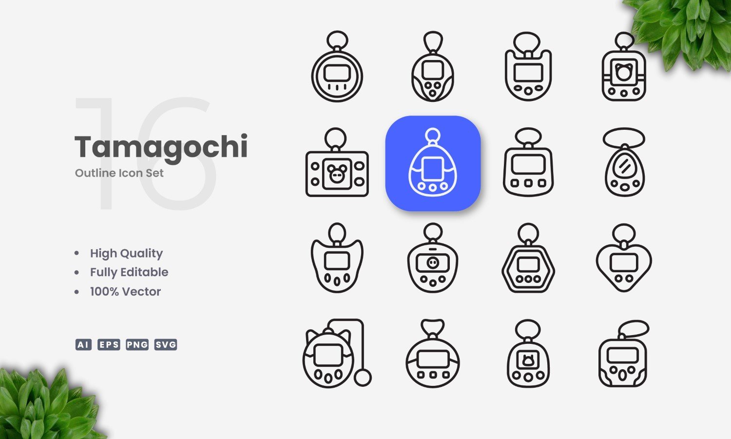 Set of 16 Tamagochi outline icons | Simple and clean design, perfect for websites, mobile apps, books, social media, infographics, flyer, print, banners, posters and many more. To resize, change color, or edit stroke weight, you can easily edit on vector software like Adobe Illustrator and CorelDRAW.
