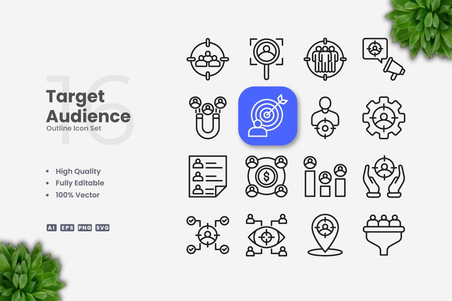 Set of 16 Target Audience Outline Icons | Simple and clean design, perfect for websites, mobile apps, books, social media, infographics, flyer, print, banners, posters and many more. To resize or change color you can easily edit on vector software like Adobe Illustrator and CorelDRAW.