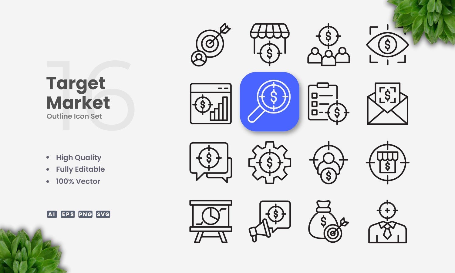 Set of 16 Target Market outline icons | Simple and clean design, perfect for websites, mobile apps, books, social media, infographics, flyer, print, banners, posters and many more. To resize, change color, or edit stroke weight, you can easily edit on vector software like Adobe Illustrator and CorelDRAW.