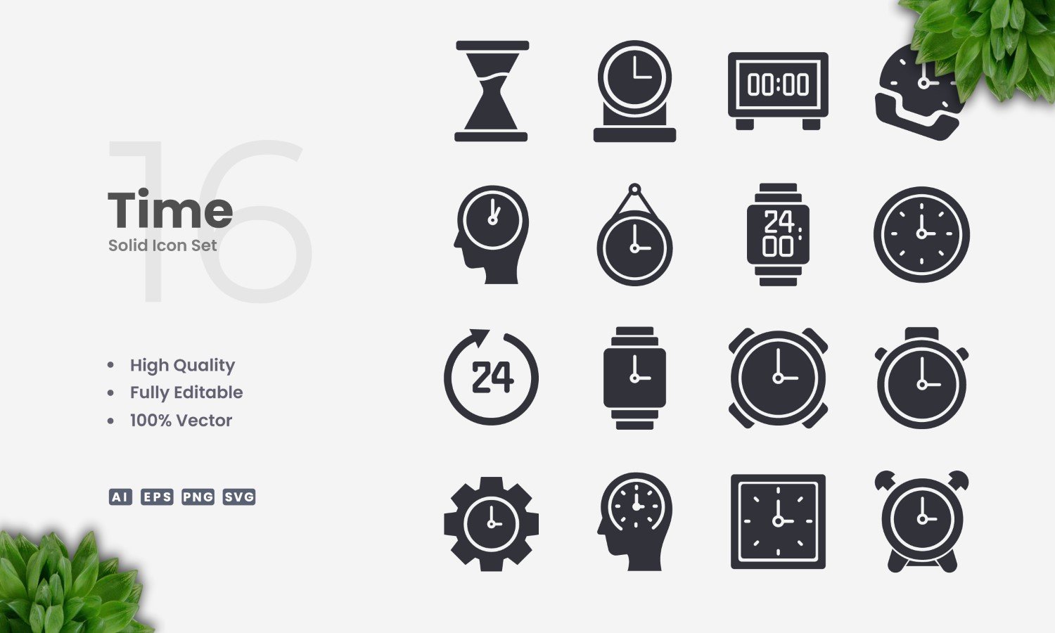 Set of 16 Time solid icons | Simple and clean design, perfect for websites, mobile apps, books, social media, infographics, flyer, print, banners, posters and many more. To resize or change color you can easily edit on vector software like Adobe Illustrator and CorelDRAW.