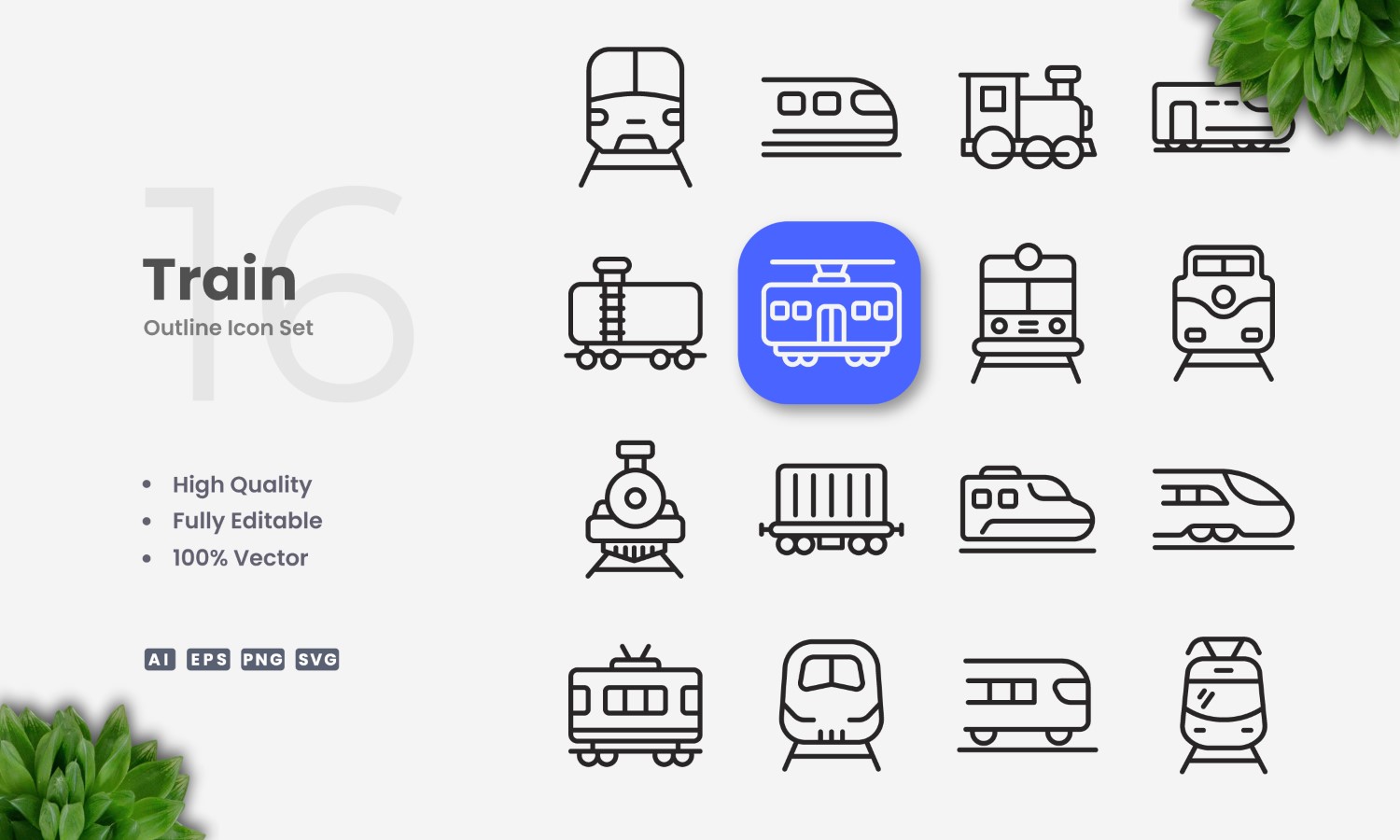 Set of 16 Train outline icons | Simple and clean design, perfect for websites, mobile apps, books, social media, infographics, flyer, print, banners, posters and many more. To resize, change color, or edit stroke weight, you can easily edit on vector software like Adobe Illustrator and CorelDRAW.