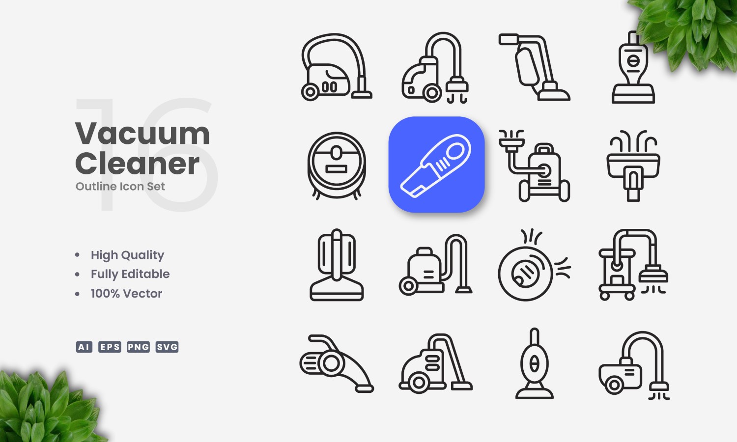 Set of 16 Vacuum Cleaner outline icons | Simple and clean design, perfect for websites, mobile apps, books, social media, infographics, flyer, print, banners, posters and many more. To resize, change color, or edit stroke weight, you can easily edit on vector software like Adobe Illustrator and CorelDRAW.