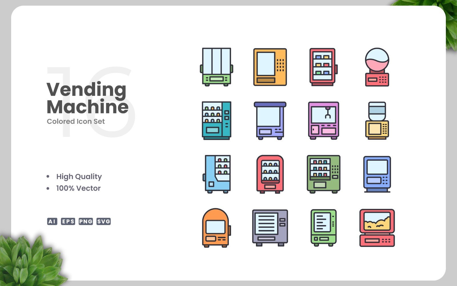Set of 16 Vending Machine colored icons | Simple and clean design, perfect for websites, mobile apps, books, social media, infographics, flyer, print, banners, posters and many more. To resize or change color you can easily edit on vector software like Adobe Illustrator and CorelDRAW.