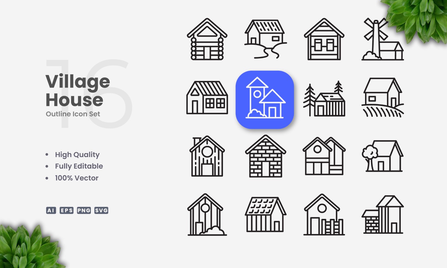 Set of 16 Village House outline icons | Simple and clean design, perfect for websites, mobile apps, books, social media, infographics, flyer, print, banners, posters and many more. To resize, change color, or edit stroke weight, you can easily edit on vector software like Adobe Illustrator and CorelDRAW.