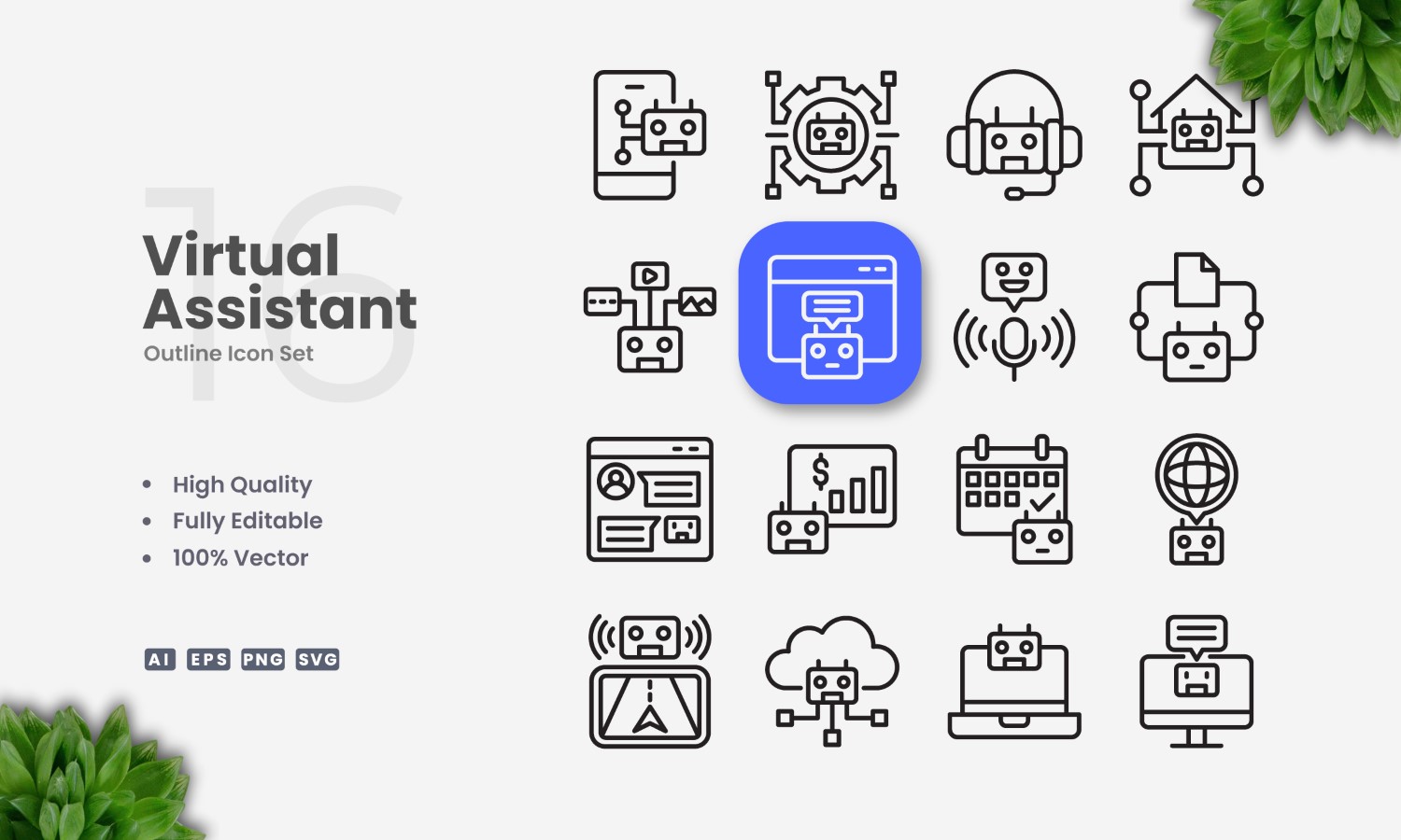 Set of 16 Virtual Assistant outline icons | Simple and clean design, perfect for websites, mobile apps, books, social media, infographics, flyer, print, banners, posters and many more. To resize, change color, or edit stroke weight, you can easily edit on vector software like Adobe Illustrator and CorelDRAW.