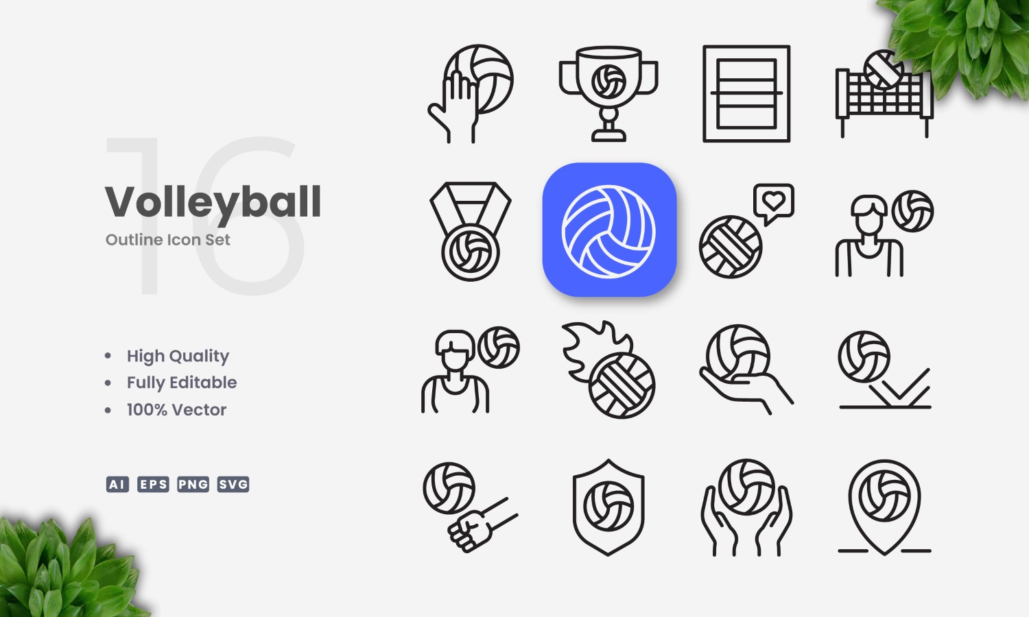 Set of 16 Volleyball outline icons | Simple and clean design, perfect for websites, mobile apps, books, social media, infographics, flyer, print, banners, posters and many more. To resize, change color, or edit stroke weight, you can easily edit on vector software like Adobe Illustrator and CorelDRAW.