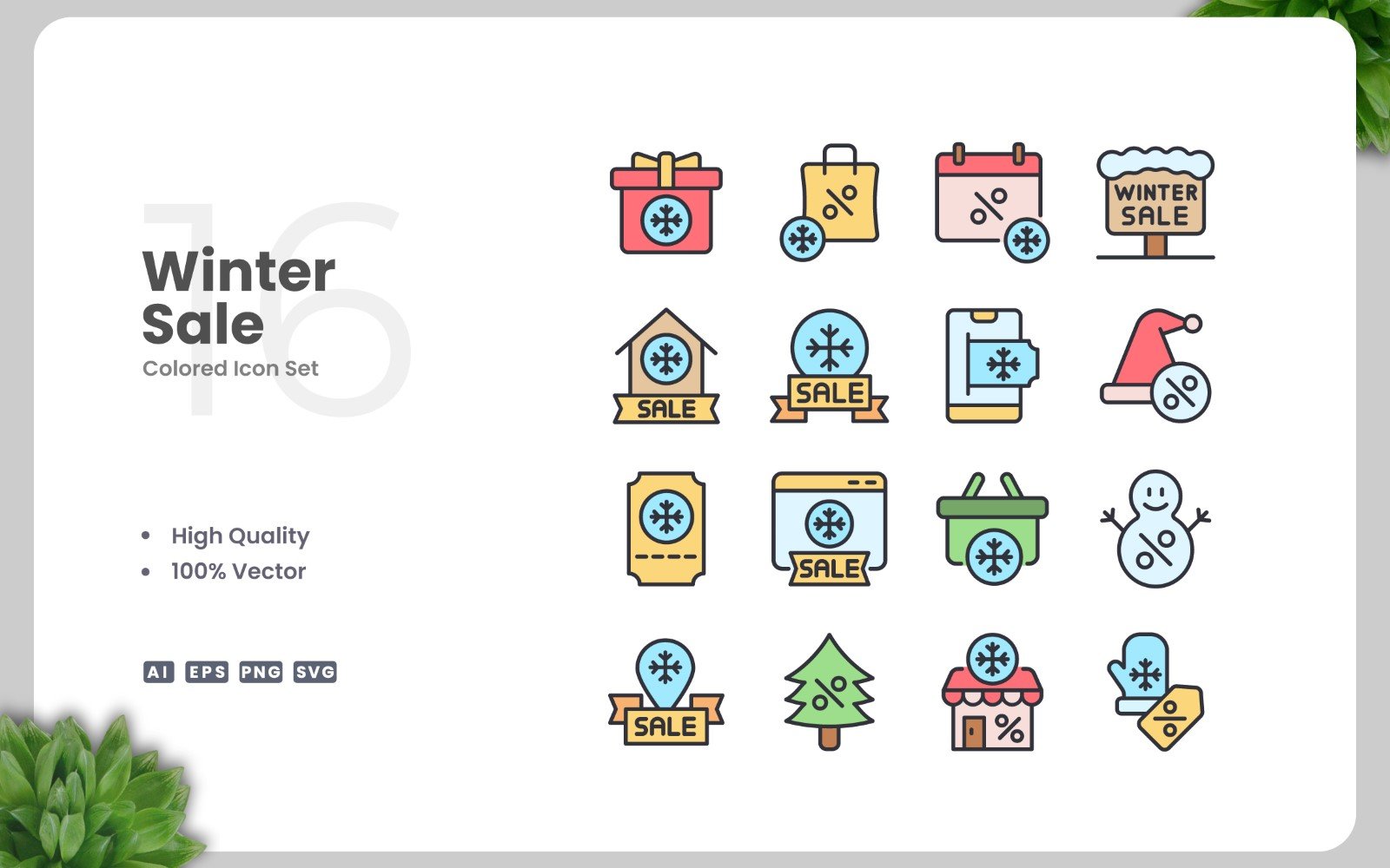 Set of 16 Winter Sale colored icons | Simple and clean design, perfect for websites, mobile apps, books, social media, infographics, flyer, print, banners, posters and many more. To resize or change color you can easily edit on vector software like Adobe Illustrator and CorelDRAW.