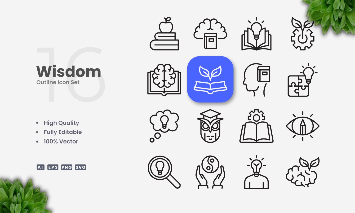 Set of 16 Wisdom outline icons | Simple and clean design, perfect for websites, mobile apps, books, social media, infographics, flyer, print, banners, posters and many more. To resize, change color, or edit stroke weight, you can easily edit on vector software like Adobe Illustrator and CorelDRAW.