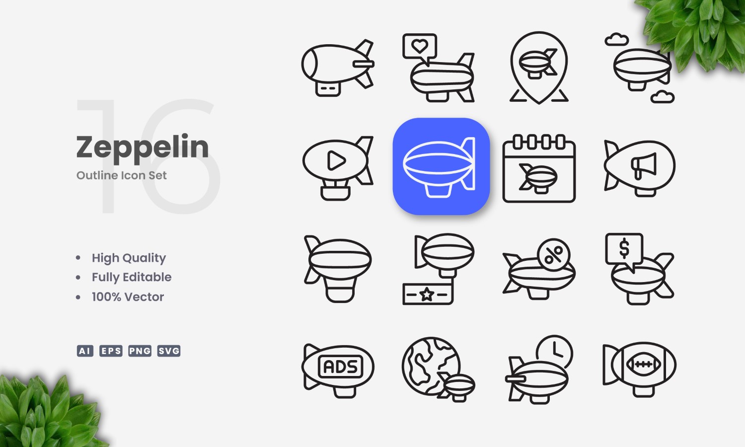 Set of 16 Zeppelin outline icons | Simple and clean design, perfect for websites, mobile apps, books, social media, infographics, flyer, print, banners, posters and many more. To resize, change color, or edit stroke weight, you can easily edit on vector software like Adobe Illustrator and CorelDRAW.