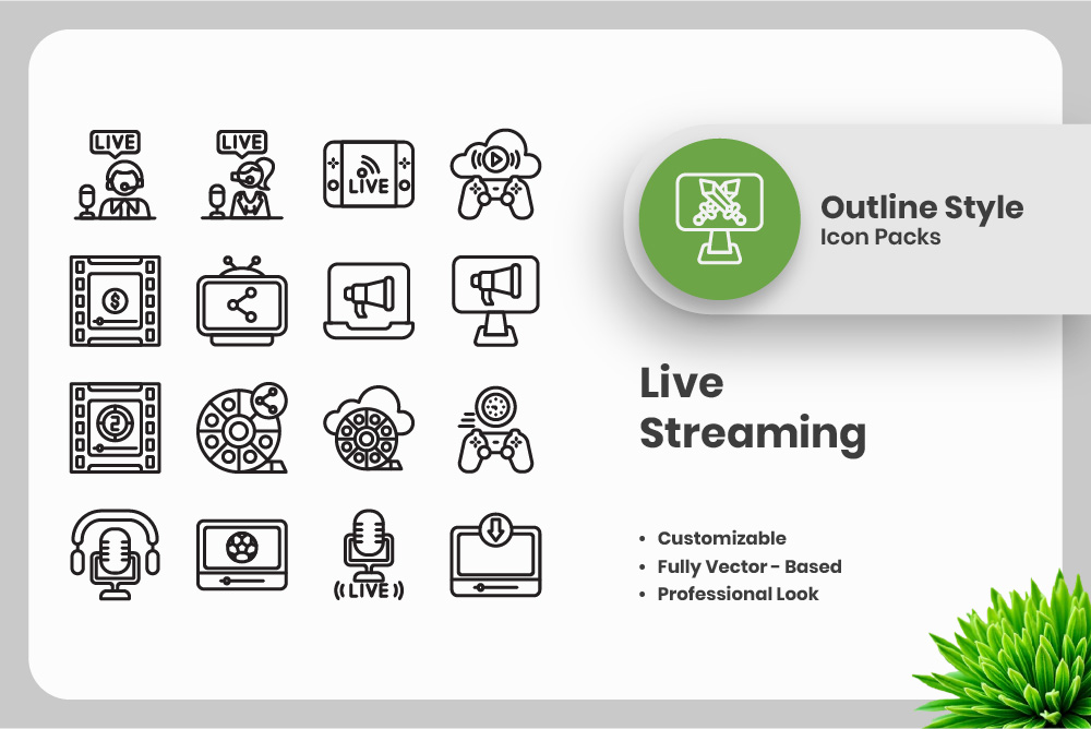 Set of 20 Live Streaming Vol 2 Outline Icons I Simple and clean design, perfect for websites, mobile apps, books, social media, infographics, flyer, print, banners, posters and many more. To resize or change color you can easily edit on vector software like Adobe Illustrator and CorelDraw.
