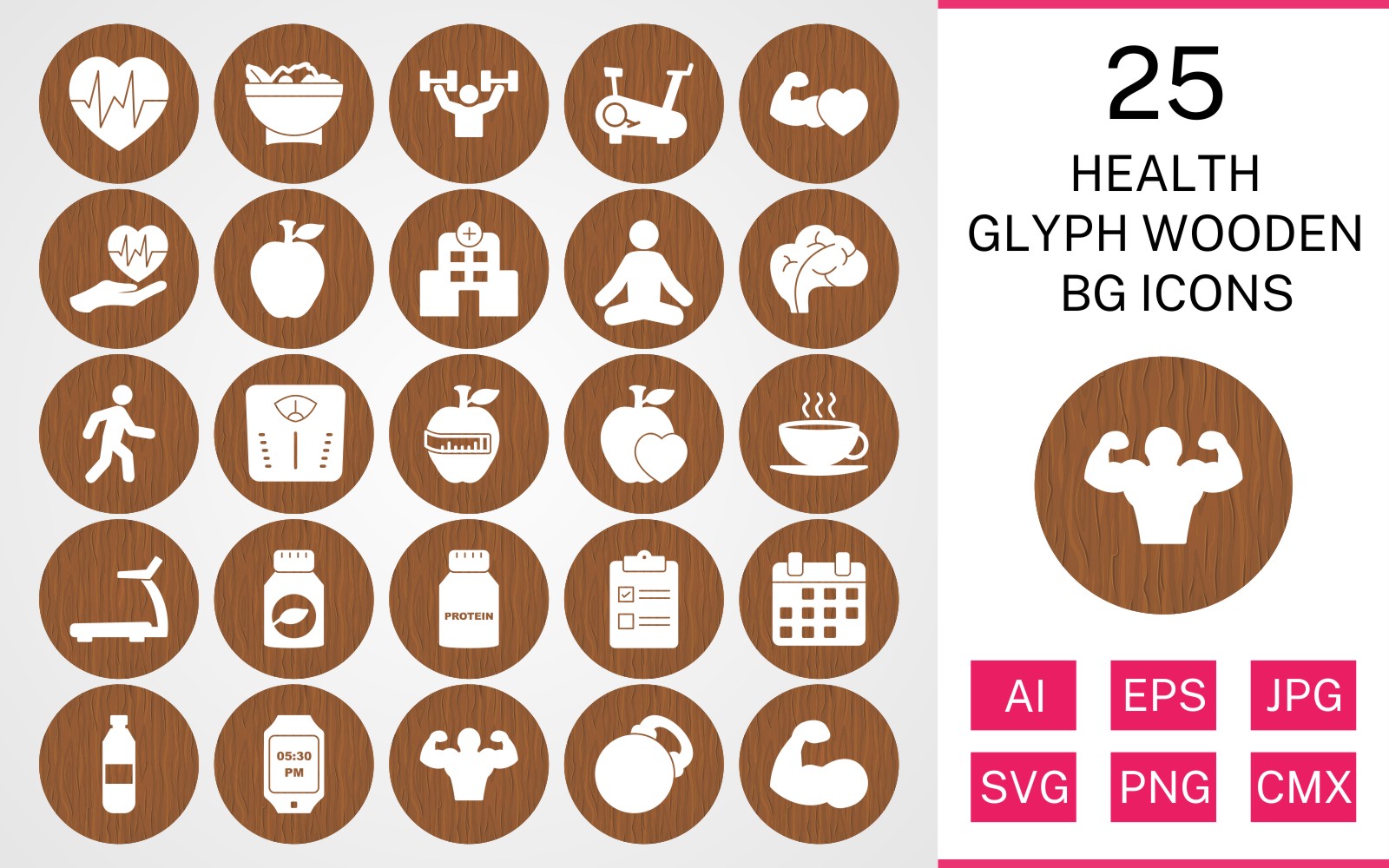 Download this premium 25 Health Glyph Wooden BG Icon Set published on TemplateMonster.