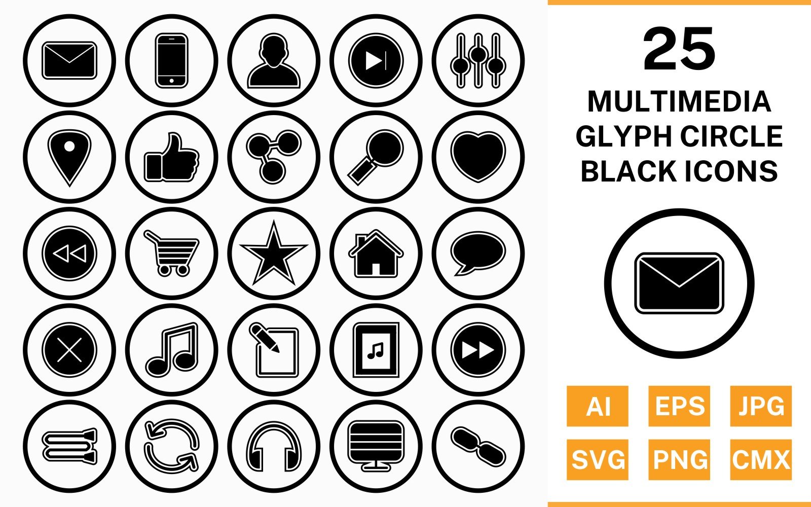 25 Multimedia Circle Glyph Outline Black Icon Set