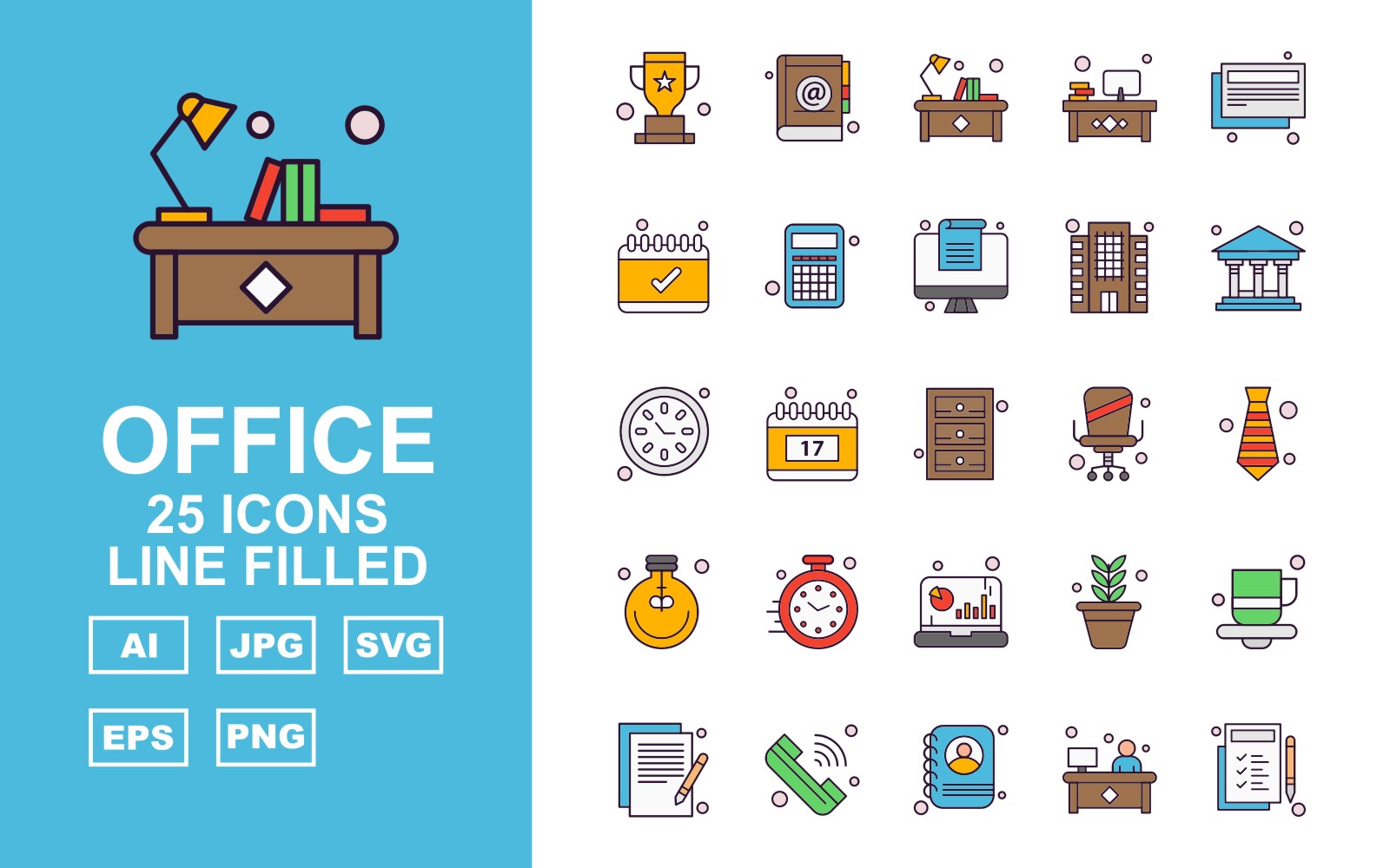 Download this premium 25 Premium Office Line Filled Pack Icon Set published on TemplateMonster.
