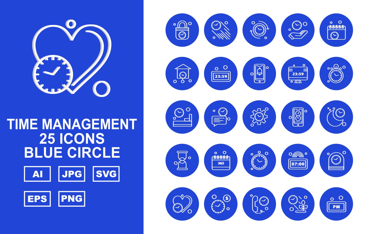 Download this premium 25 Premium Time Management Blue Circle Icon Set published on TemplateMonster.