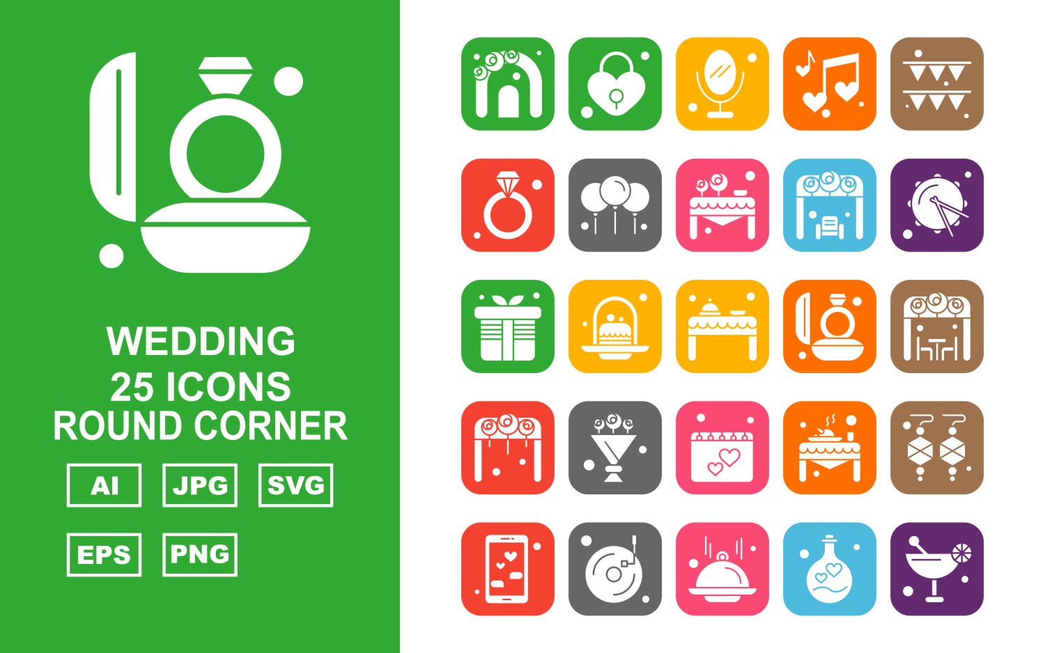 Download this premium 25 Premium Wedding Round Corner Pack Icon Set published on TemplateMonster.