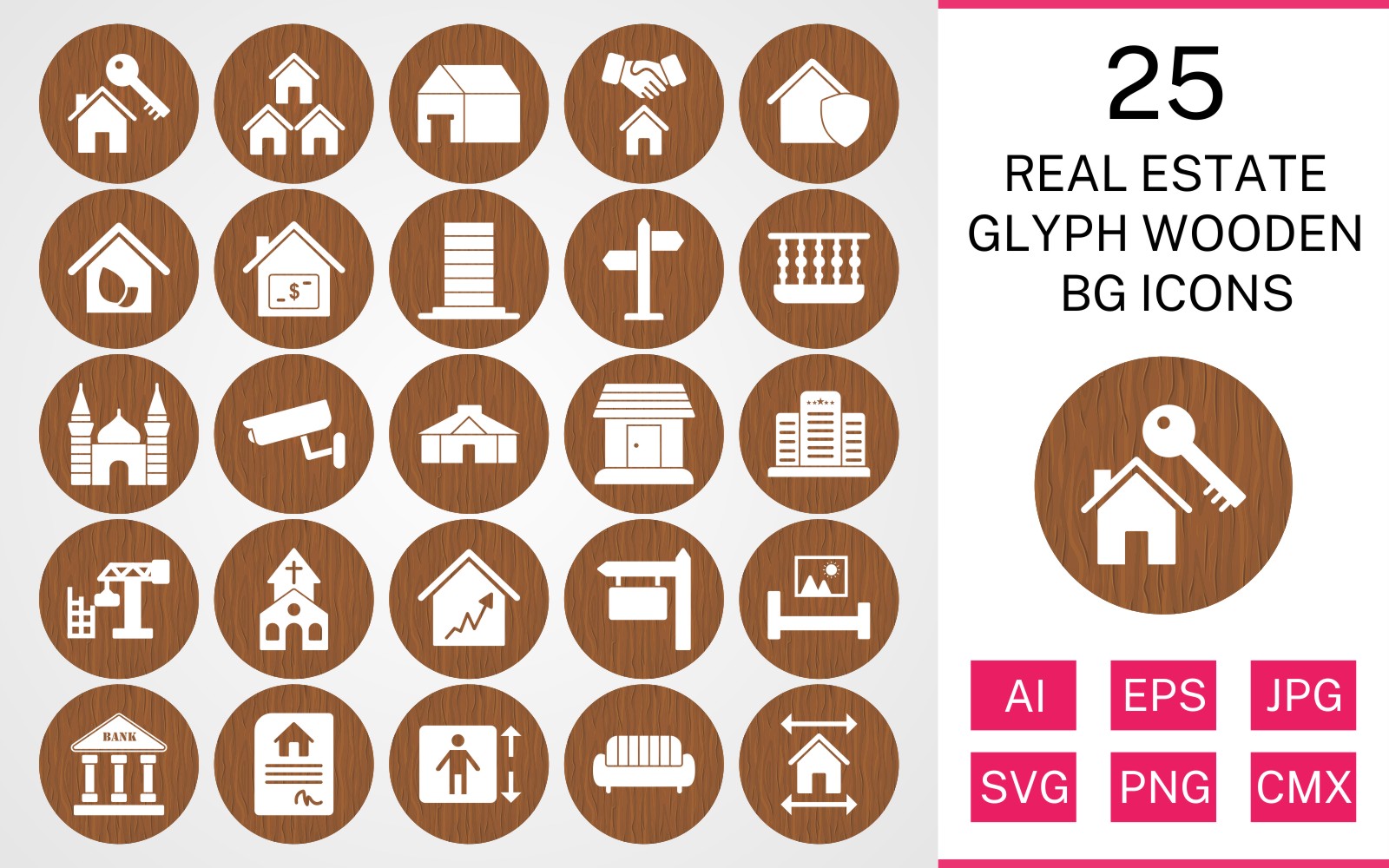 Download this premium 25 Real Estate Glyph Wooden BG Icon Set published on TemplateMonster.