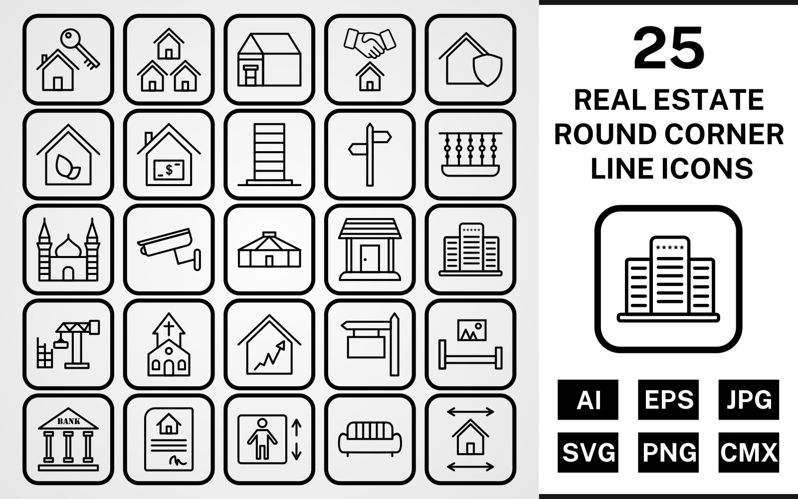 Download this premium 25 Real Estate Round Corner Line Black Icon Set published on TemplateMonster.