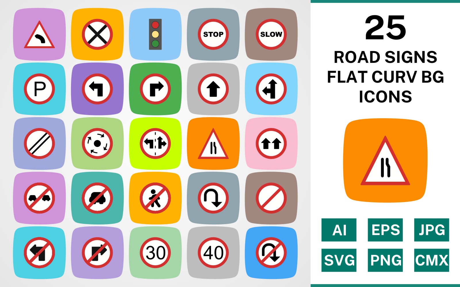 25 ROAD SIGNS FLAT CURV BG PACK Icon Set