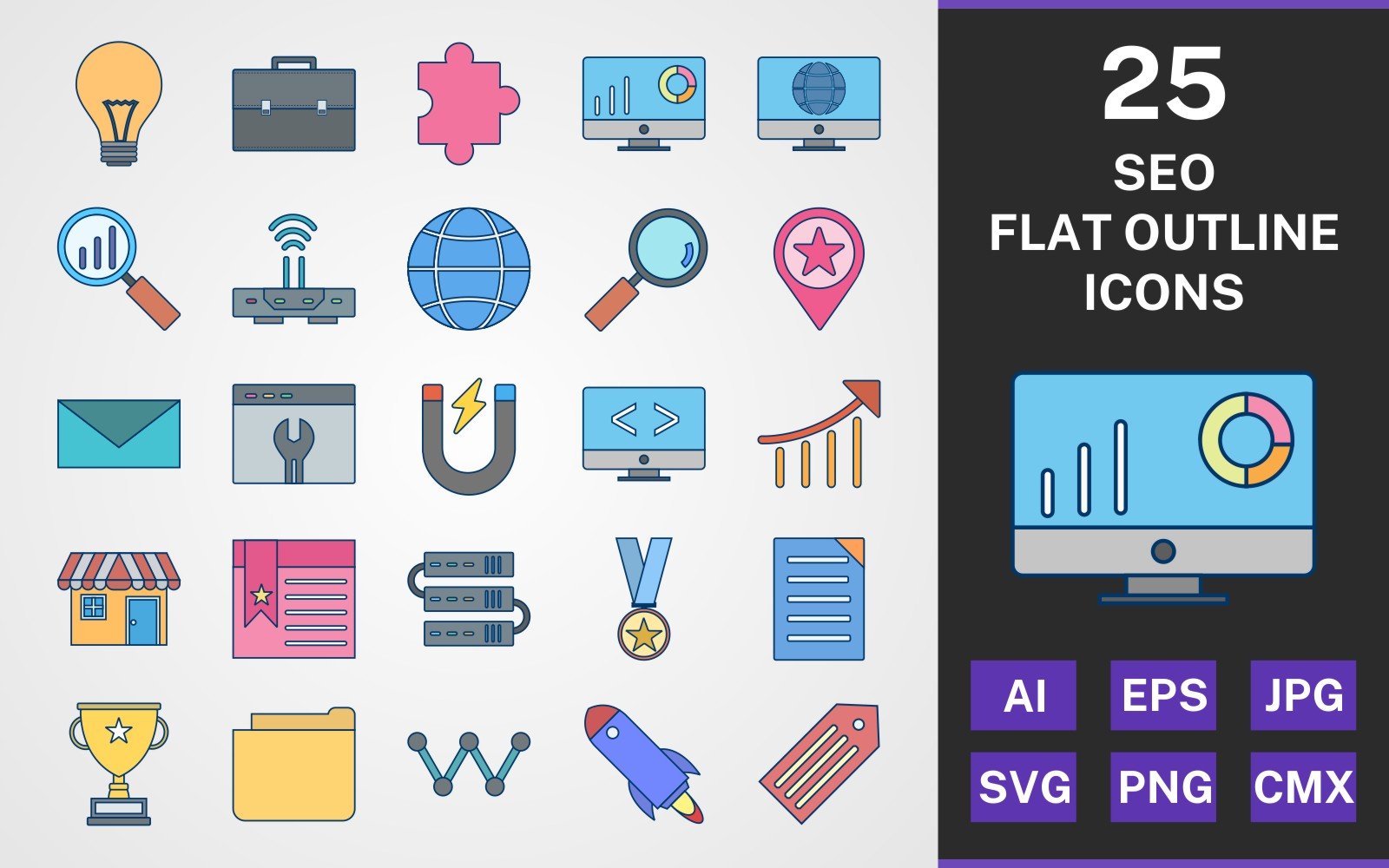 Download this premium 25 SEO FLAT OUTLINE PACK Icon Set published on TemplateMonster.