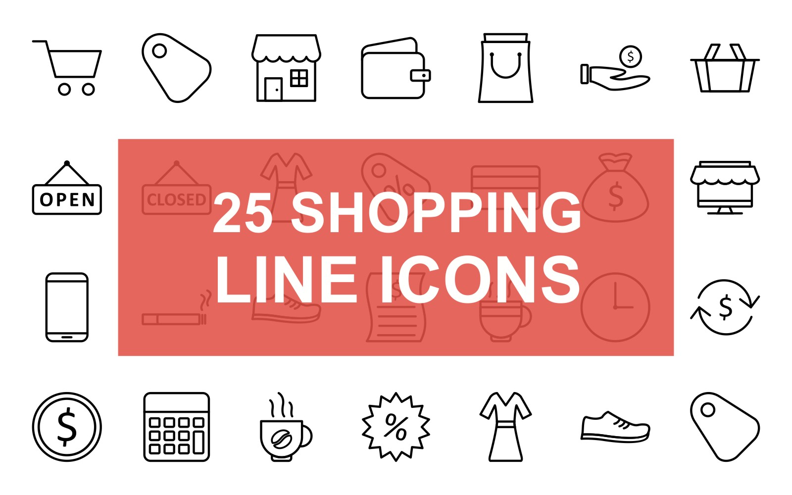 25 Basic Line Shopping icons in Six File format,(AI, EPS, CDR, JPG, PNG, SVG) that covers basic user interface needs. Perfect for use in: