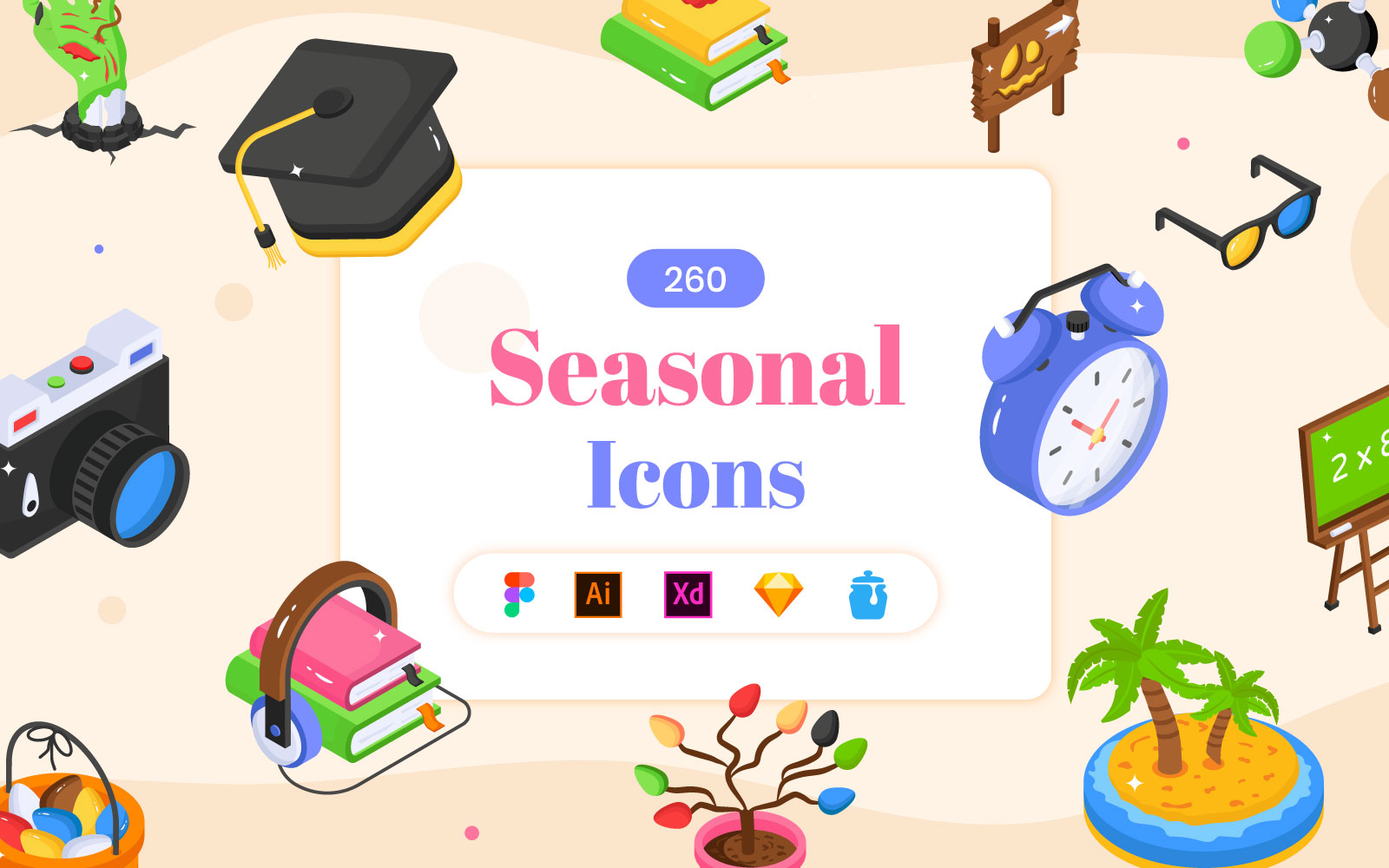 Boost your project with this impressive collection of seasonal icons that contains some fun-filled graphics related to summer and holidays. These designs are ready to use and suitable for websites, mobile apps, and social media.