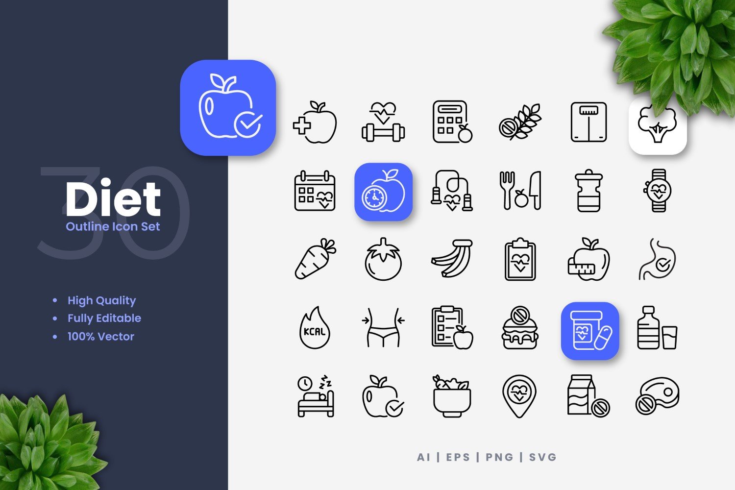 Set of 30 Diet Outline Icon Collection | Simple and clean design,perfect for websites, mobile apps, books, social media, infographics, flyer, print, banners, posters and many more. To resize, change color, or edit stroke weight ,you can easily edit on vector software like Adobe Illustrator and CorelDRAW.