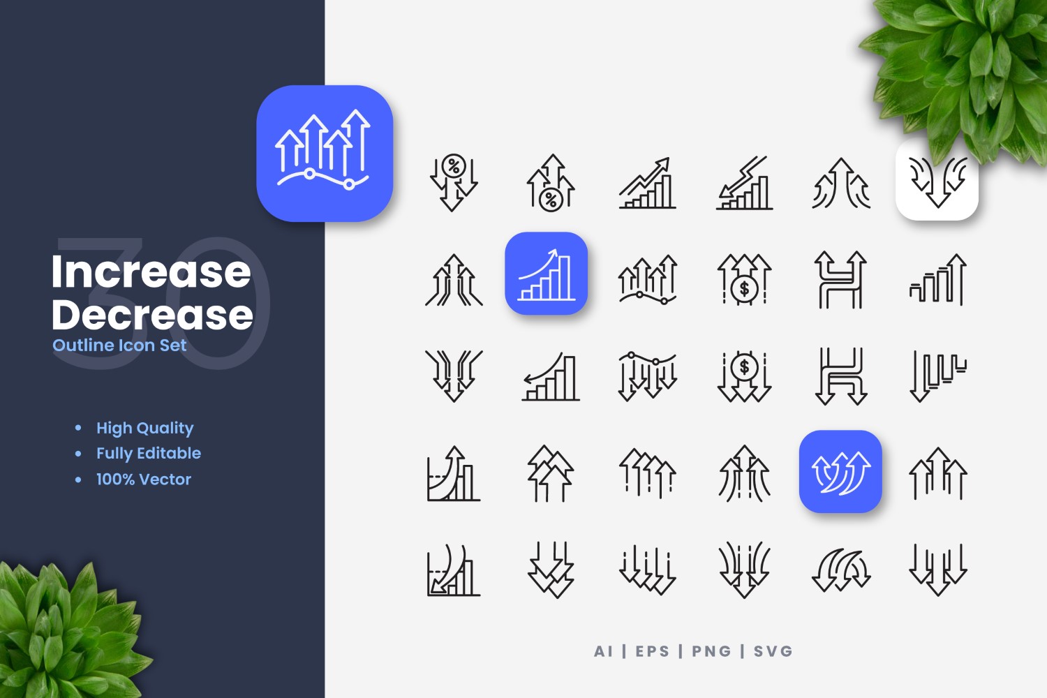 Set of 30 Increase and Decrease outline icons | Simple and clean design,perfect for websites, mobile apps, books, social media, infographics, flyer, print, banners, posters and many more. To resize, change color, or edit stroke weight ,you can easily edit on vector software like Adobe Illustrator and CorelDRAW.