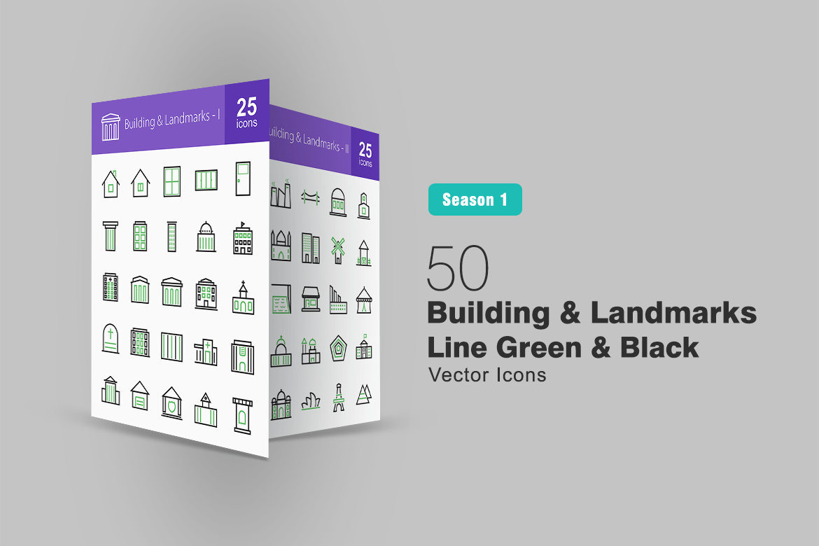 Download this premium 50 Buildings & Landmarks Line Green & Black Icon Set published on TemplateMonster.